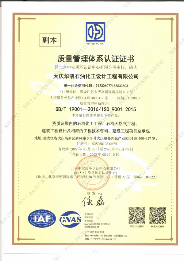 近日,我司順利通過質量管理體系認證,這標志著華凱公司在項目質量體系建設上已經達到了相關標準。質量管理體系認證證書的取得同時也是公司各項管理工作的規范化、標準化的體現,是對公司持續穩定健康發展的重要保證。我們將進一步優化和規范各項管理制度,不斷提高體系運行的有效性,不斷提高公司的管理水平,共同推進公司的快速發展。自此,華凱公司質量管理體系的標準化、規范化及科學化又邁上新臺階。